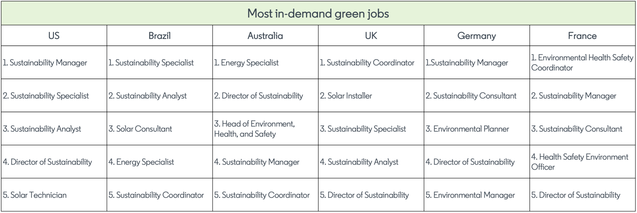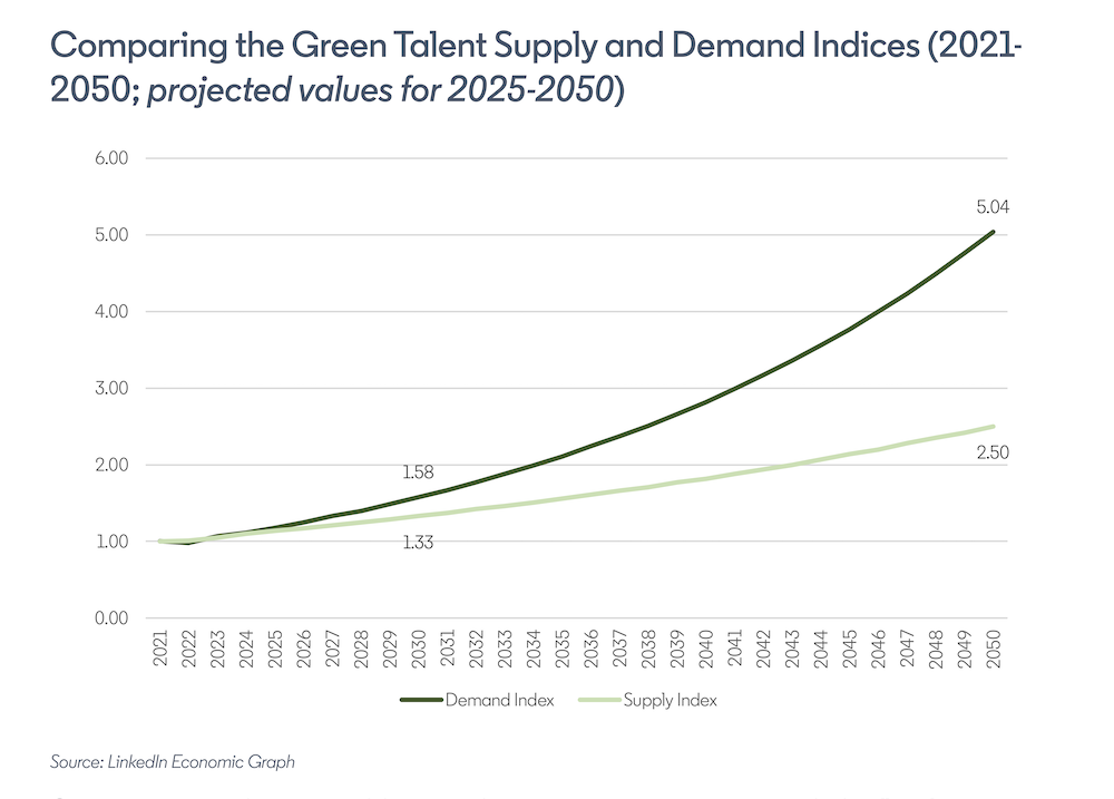 Werknemers met ‘groene’ vaardigheden en ervaring in groene banen zijn veelgevraagd en hebben een aanzienlijk grotere kans om aangenomen te worden. Wereldwijd hebben werkzoekenden met groene vaardigheden of titels een 54,6% hogere aanwervingskans dan de totale beroepsbevolking. In de Verenigde Staten wordt 80,3% meer groen talent aangenomen dan de rest, in Ierland 79,8% en in het Verenigd Koninkrijk 72%. Zelfs in landen waar het aantal groene vacatures is gedaald, zoals Finland en Nederland, blijven kandidaten met groene vaardigheden positief opvallen.