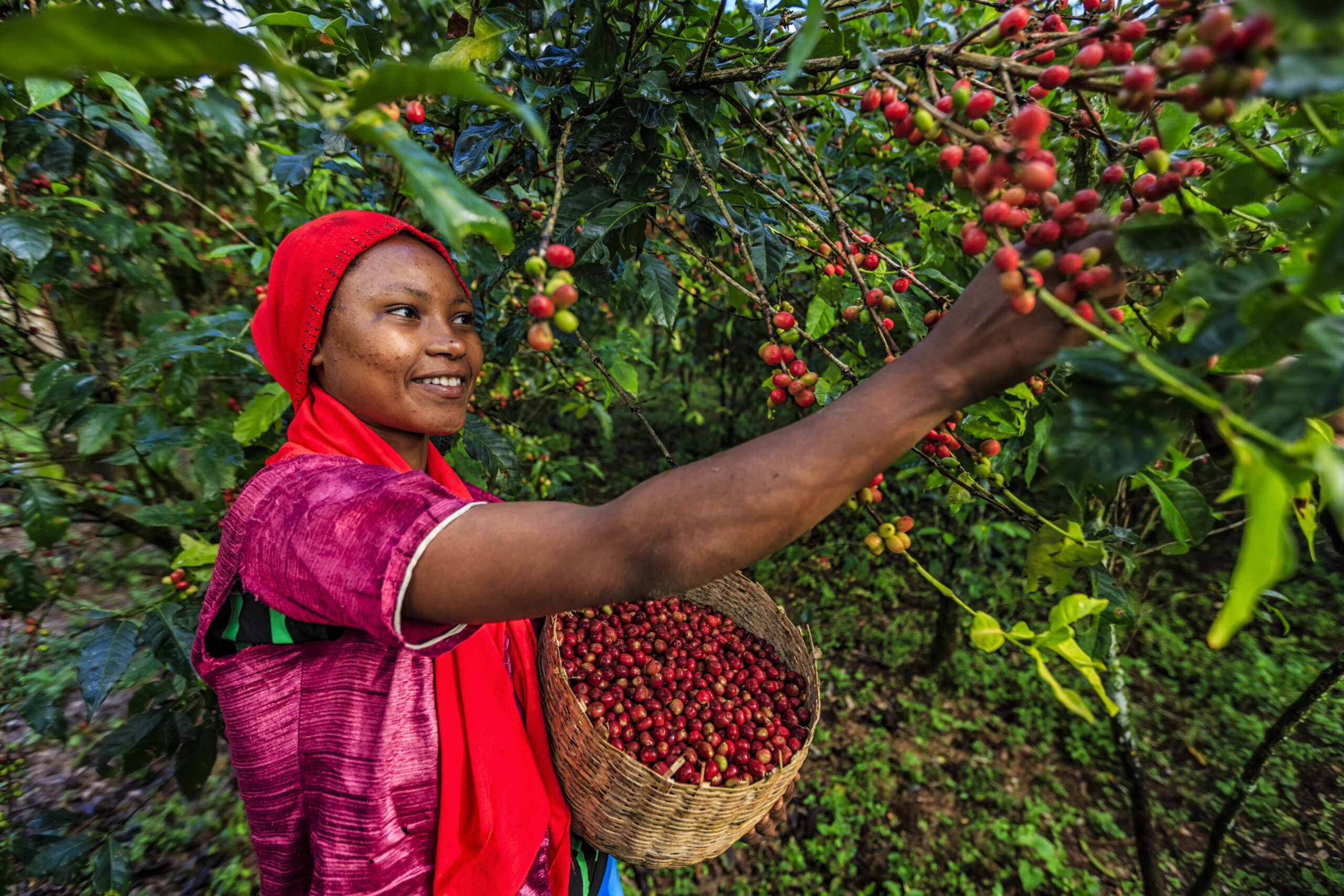 Young African woman collecting coffee berries from a coffee plant, Ethiopia, Africa. There are several species of Coffea – the coffee plant. The finest quality of Coffea being Arabica, which originated in the highlands of Ethiopia. Arabica represents almost 60% of the world’s coffee production..