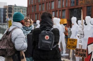Vandaag op Black Friday protesteren op het Stationsplein in Leiden zo’n 30 naakte paspoppen tegen slechte arbeidsomstandigheden. De paspoppen staan symbool voor de uitgeklede makers van onze kleding. Ze houden protestborden vast met slogans over misstanden in de kledingindustrie onder het motto: Trek jij het je aan?