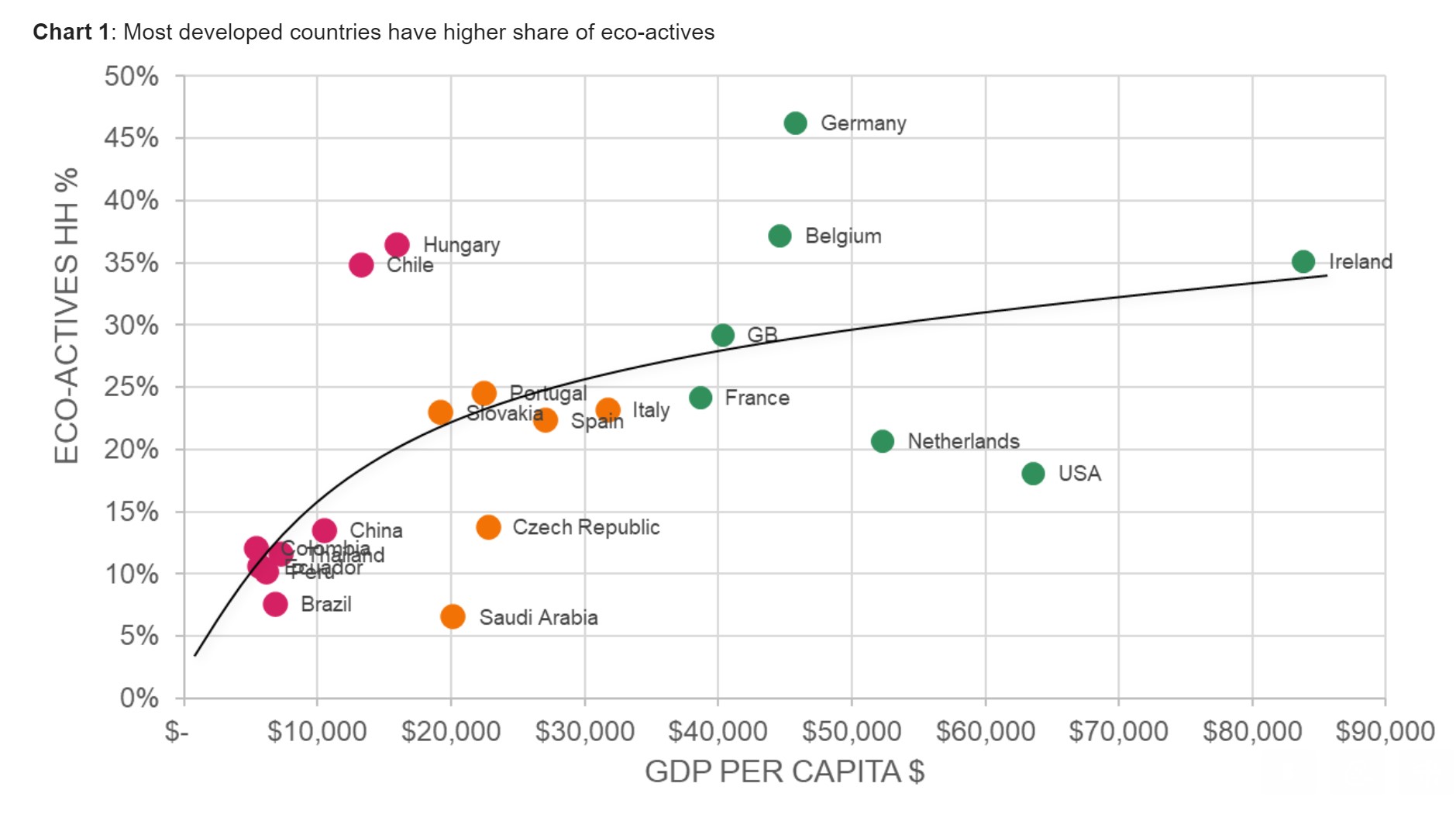 Germany has the largest Eco-actives segment – accounting for 46% of households in 2021, followed by Belgium and Hungary. At just 7% of households, Saudi Arabia is the country with the lowest penetration of eco-actives. There is a direct correlation between GDP per household and the prevalence of eco-active households (see chart 1). Of the more economically advanced countries, the Netherlands and the United States have the lowest incidence of Eco-actives.