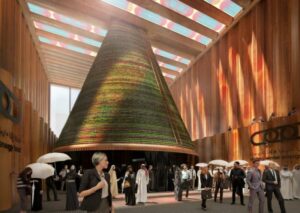 Designer Ap Verheggen & SunGlacier Technologies developed the solar-powered rain shower ‘SunGlacier’, a Dutch innovation that allows to harvest hundreds of liters water at the pavilion every day. The sustainable solar-powered water-from-air technology makes it possible in the future to produce food without being dependent on rainfall, rivers or other traditional water sources. The ‘SunGlacier’ technology will extract hundreds of litres of water daily from the desert air. The water will be purified using a distinctive, innovative method.