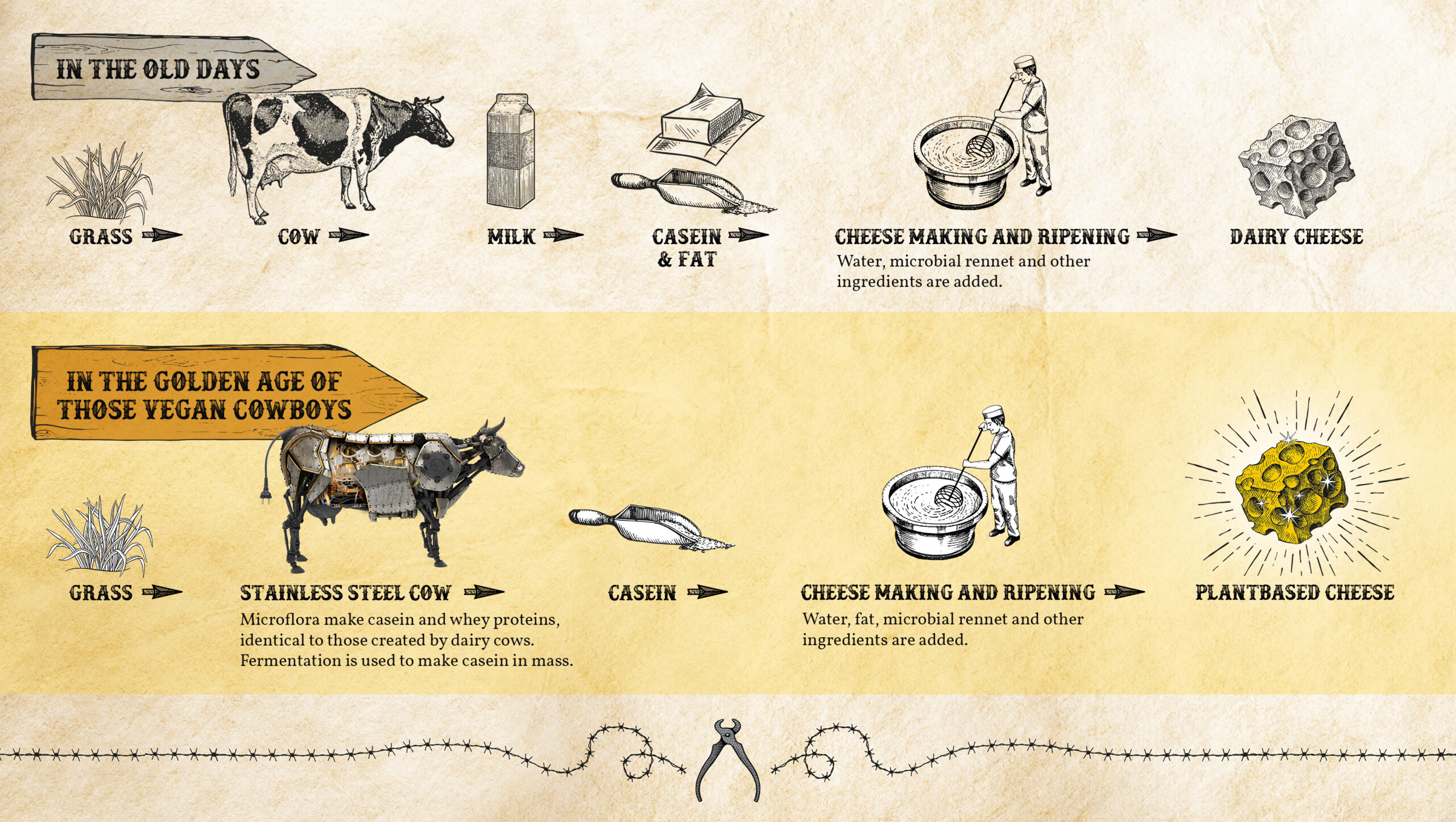 De Nederlands/Belgische startup Those Vegan Cowboys begon in 2020 met het ontwikkelen van zuivel-identieke caseïnes. In plaats van in de melkklieren van een koe worden de eiwitten geproduceerd door microben in een fermentatietank, bijgenaamd Margaret, de roestvrijstalen koe (vernoemd naar Thatcher, The Iron Lady). Caseïne-eiwitten zijn essentieel voor het maken van kaas die goed smaakt, rekt en smelt. Chief Technology Officer Will van den Tweel: “Gaandeweg realiseerden we ons dat functioneel gezien de koe misschien niet de beste bron van caseïne voor kaas is.”