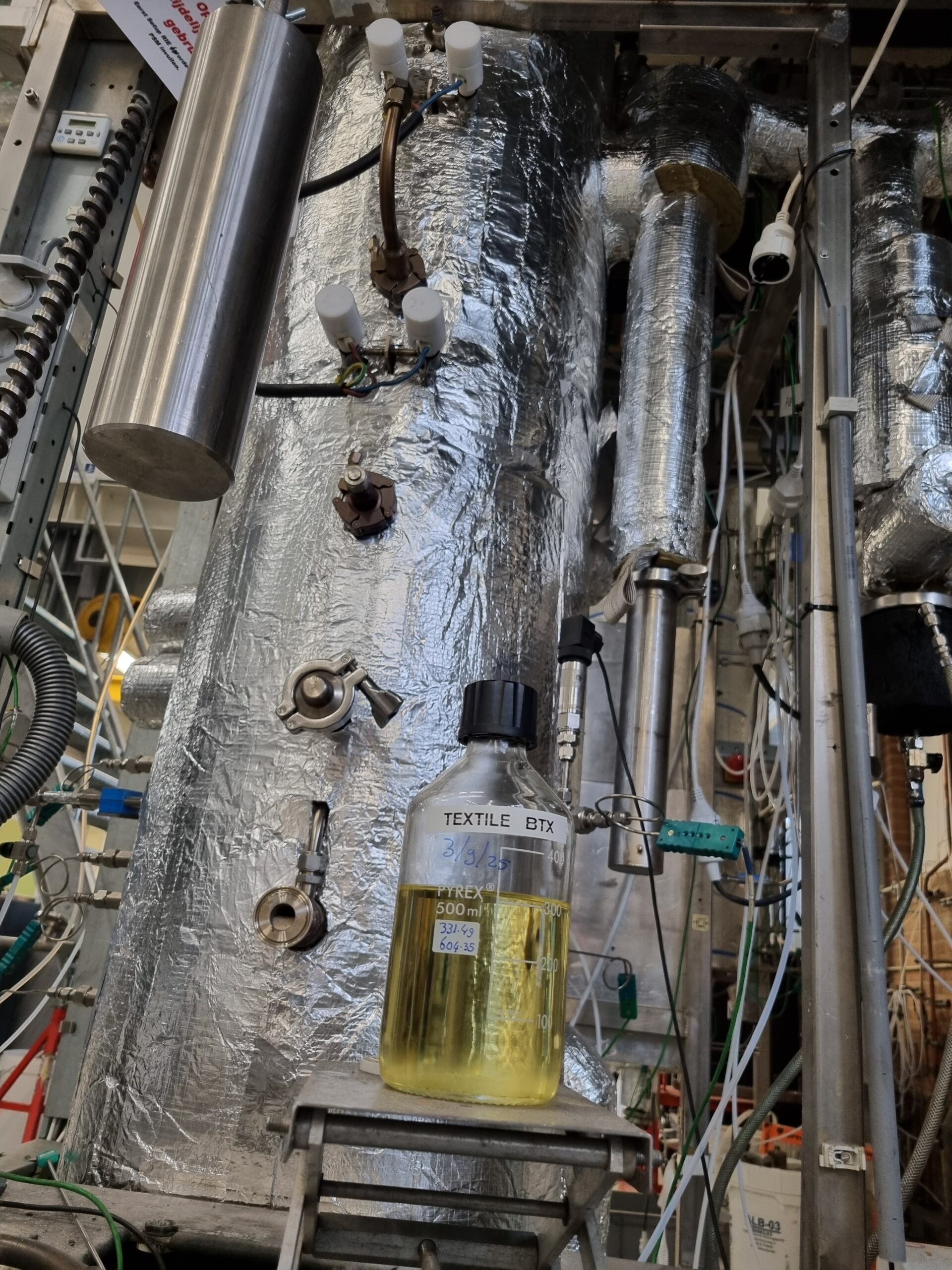 De aanpak is getest met daadwerkelijk post‑consumer textielafval van Nederlandse sorteerders: T‑shirts, werkkleding en jeans die normaal gesproken rechtstreeks naar de verbrandingsoven gaan. In een meerurenproef wist het team uit 1,5 kg mixed waste een halve liter aromaten terug te winnen, waarvan circa 70 procent benzeen.