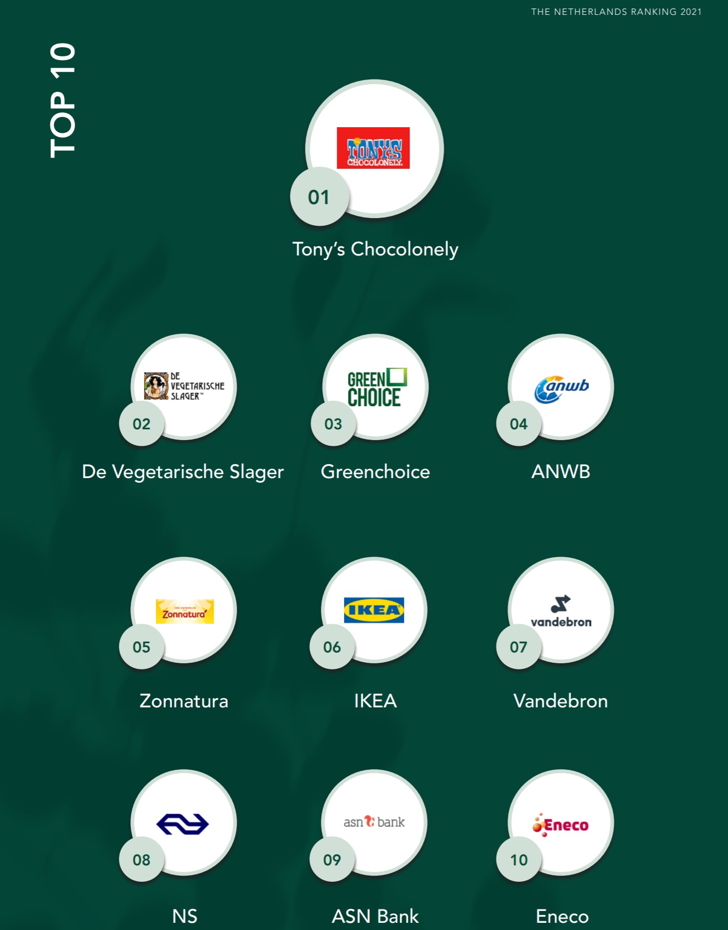 Tony’s Chocolonely is dit jaar voor de vierde keer uitgeroepen tot het meest duurzame merk van Nederland. Dat blijkt uit het Nederlandse onderzoek achter Sustainable Brand Index, dat vandaag gepubliceerd is. Hierin wijzen consumenten de meest duurzame merken in Nederland aan. Het werd een close call dit jaar. Het scheelde maar heel weinig of De Vegetarische Slager had de nummer 1-positie dit jaar overgenomen. De Vegetarische Slager bemachtigde een tweede plek in de Sustainable Brand Index van 2021. Het verschil was slechts achter de komma zichtbaar. De categorie ‘vleesvervangers’ werd dit jaar voor het eerst meegenomen binnen de voedingsmiddelenindustrie (Food).