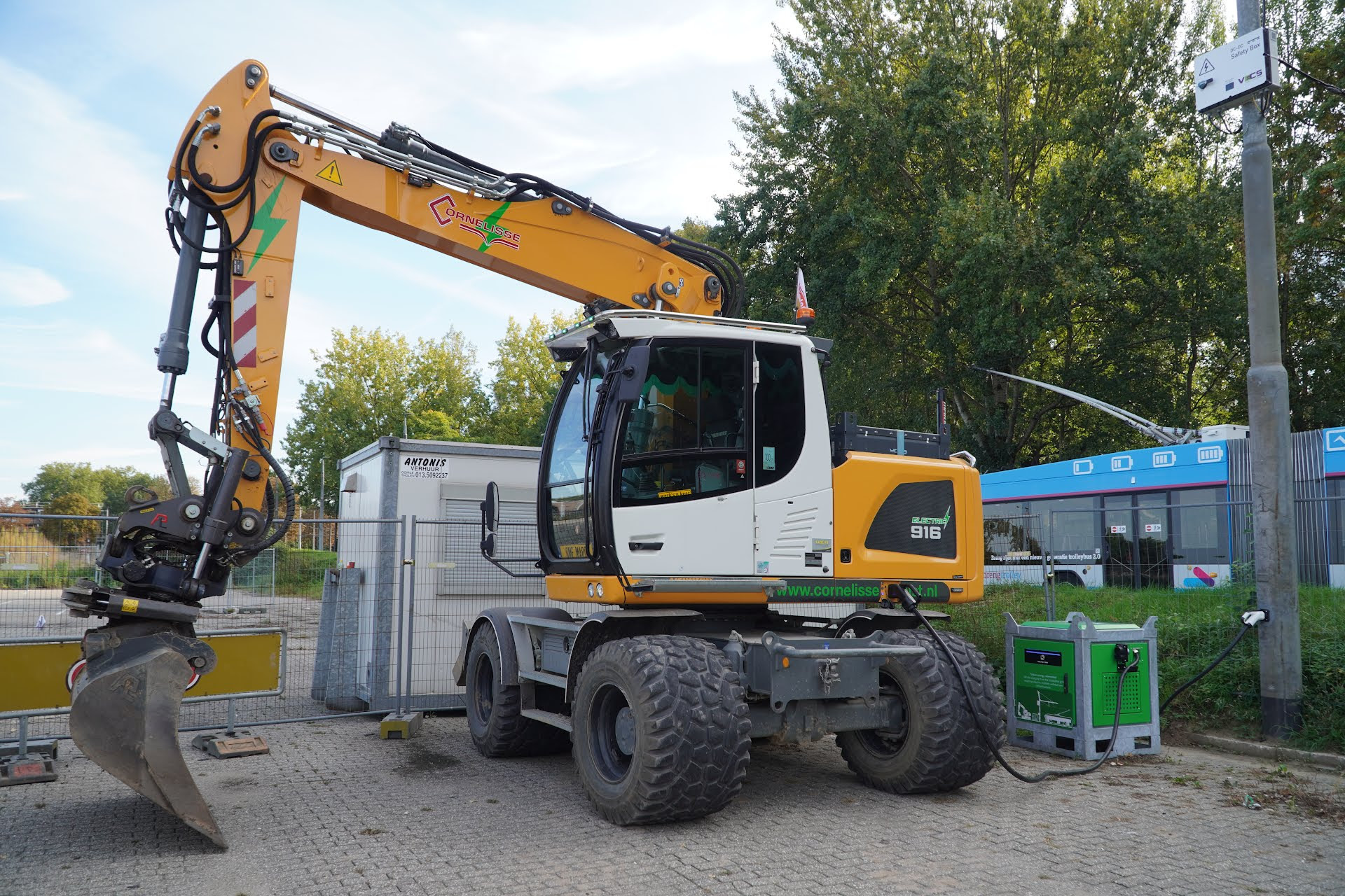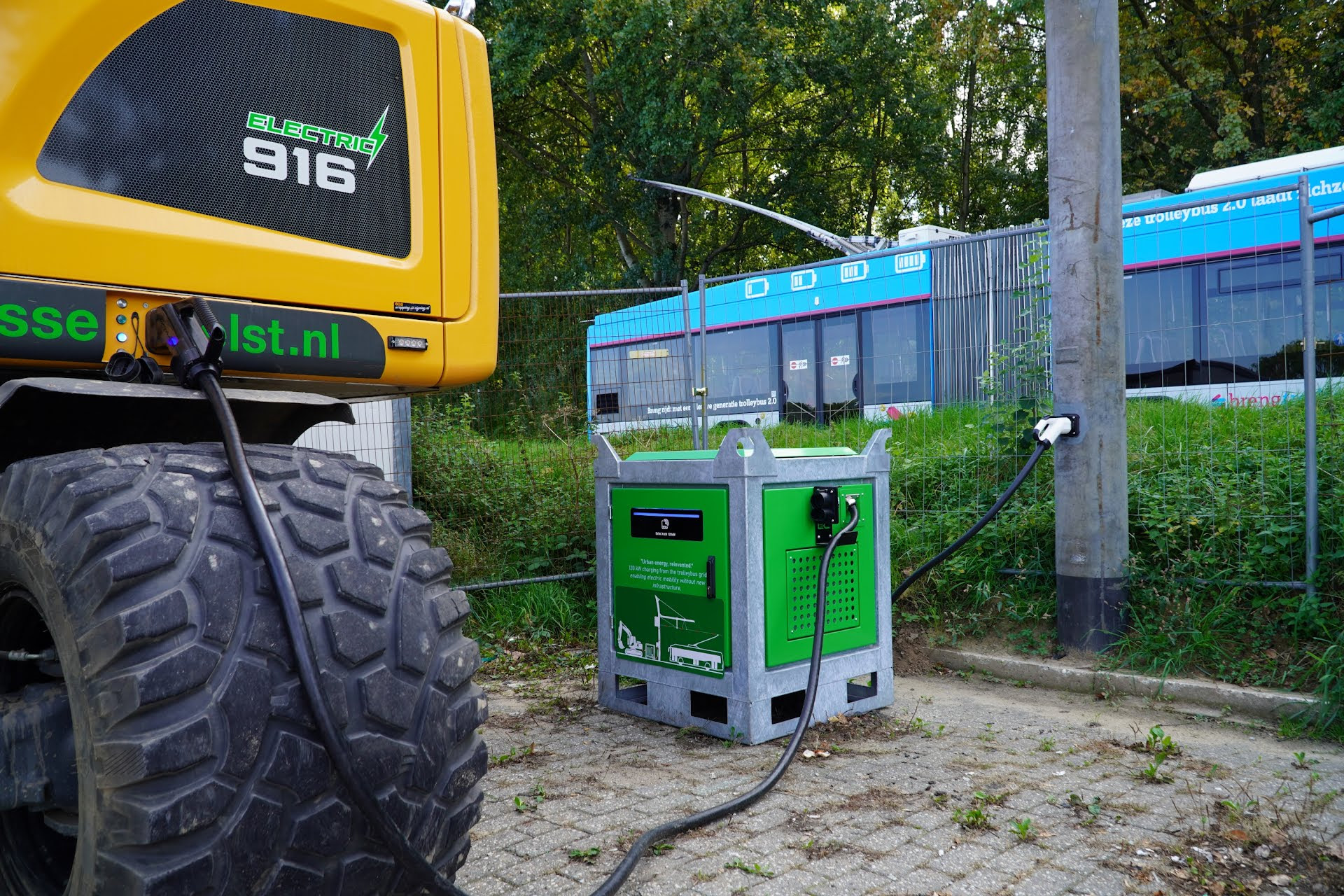 Het trolleynet ligt als een spinnenweb door de hele stad. Daardoor is er altijd een trolleymast in de buurt van een bouwplaats. Het is de bedoeling dat gedurende een wegreconstructie er enkele industriële laadpunten’ met hoge vermogens aan een trolleymast worden geïnstalleerd. Tijdelijk, voor de duur van de werkzaamheden. Daarna wordt het laadpunt weer weggehaald en kan het elders in de stad dienst doen. ’s Nachts – als er bijna geen bussen rijden – kan al het zware elektrisch materieel worden opgeladen. Om overdag extra stroom te hebben, is het mogelijk om een of meer grote batterijen op te laden. Zo kan er de hele dag zero-emissie gewerkt worden.
