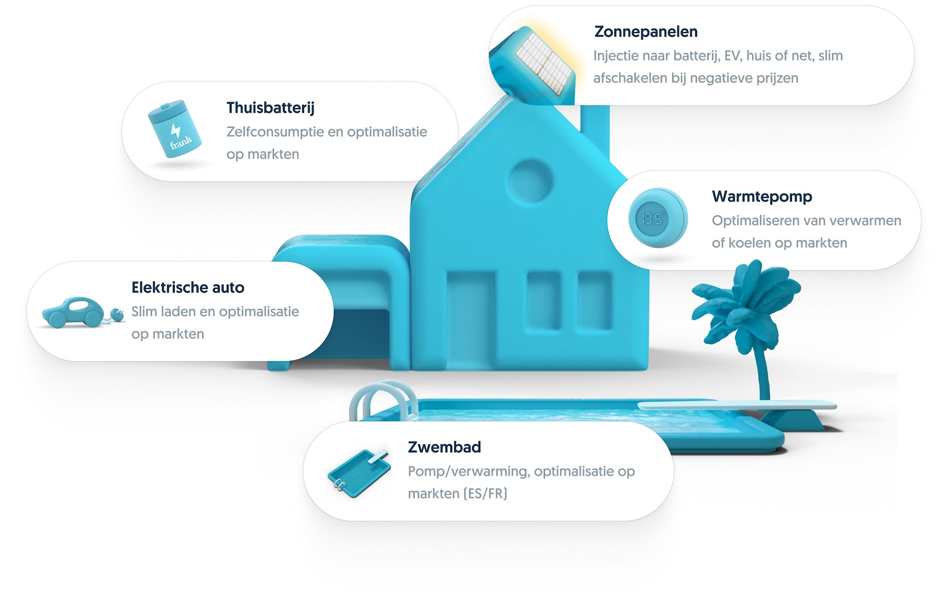 Frank Energie is een van de grootste aanbieders van dynamische energiecontracten. Daarbij wordt de prijs bepaald aan de hand van de handelsprijzen, waardoor de stroom- en gasprijzen elk uur (stroom) en elke dag (gas) kunnen veranderen. Volgens cijfers van de ACM hebben inmiddels 343.000 (5 procent) huishoudens zo’n contract, vijf keer zoveel als anderhalf jaar geleden. Zo’n contract biedt de mogelijkheid om stroomverbruik te verplaatsen of stroom op te slaan in de thuisbatterij op momenten dat het goedkoop is of, zonnestroom terug te leveren als de stroomprijs het hoogst is en of de elektrische auto op te laden als de prijs laag is. Met de batterij kunnen mensen ook handelen op elektriciteitsmarkten. Omdat de groene stroomprijzen momenteel relatief laag zijn, verdient die batterij meer geld op de onbalans of straks op de netcongestiemarkt. Daar betalen netbeheerders om met meer of minder stroom het net in balans te houden of vraag en aanbod van stroom beter op elkaar af te stemmen om overbelasting van het net te voorkomen. Alle prijzen, alle handel, energie-opwek en verbruik, teruglevering en het laden van batterij of auto is bij Frank Energie te volgen en in te stellen via een app.
