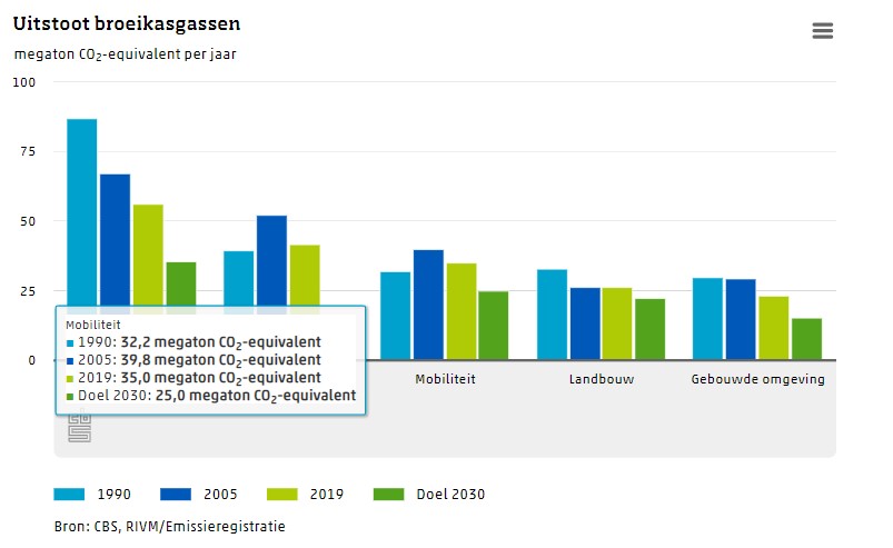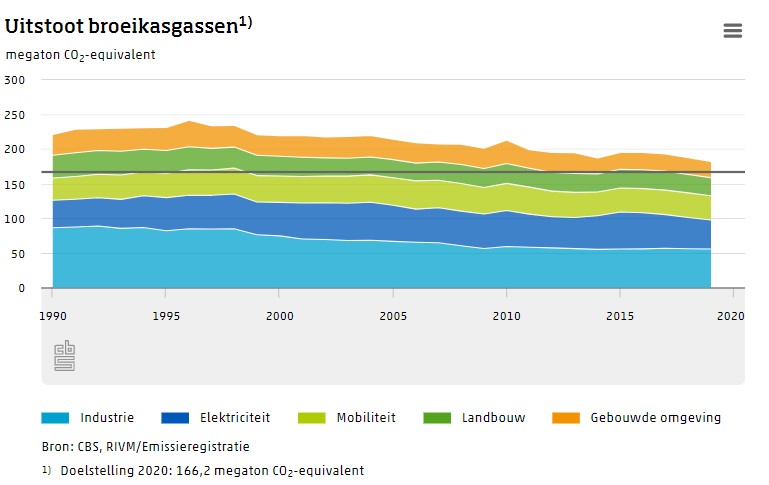 Voor 2030 beoogt het klimaatakkoord een reductie van 49 procent ten opzichte van 1990. De komende 11 jaar is een afname van 70 megaton CO2-equivalent nodig om dit doel te halen. Tussen 1990 en 2019 is een afname van 39 megaton CO2-equivalent gerealiseerd. Deze daling kwam voor het overgrote deel voor rekening van de niet-CO2-broeikasgassen methaan, lachgas en de zogeheten F-gassen; de emissie hiervan halveerde tussen 1990 en 2019. De emissie van CO2 daarentegen is in deze periode nagenoeg gelijk gebleven.
