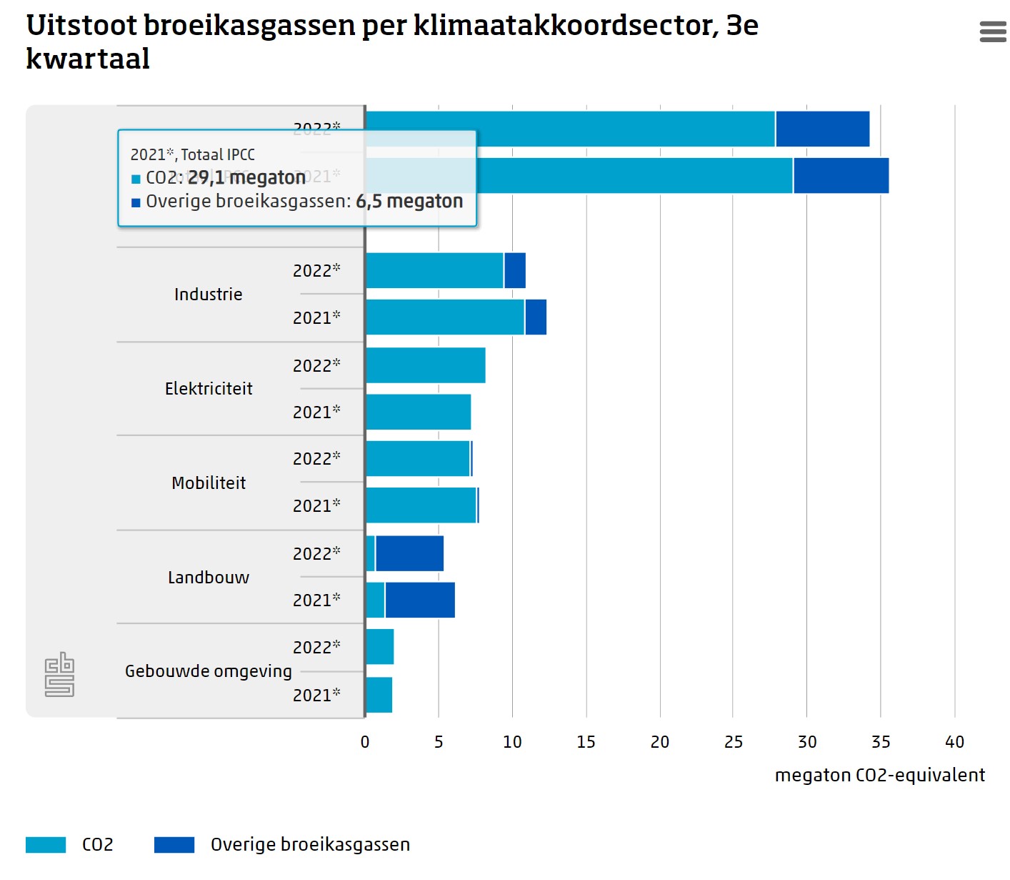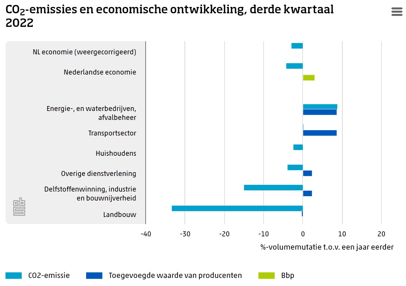 De CO2-uitstoot door de Nederlandse economie was in het derde kwartaal ruim 4 procent lager dan in hetzelfde kwartaal van 2021, terwijl het bruto binnenlands product (bbp) in diezelfde periode met 3,1 procent groeide. Voor vrijwel alle sectoren van de economie geldt dat de productie hoger lag, terwijl de CO2-emissies lager waren. Zo daalden de emissies in de industrie, delfstoffenwinning en bouwnijverheid met 15 procent, terwijl de toegevoegde waarde 2,5 procent hoger lag. De afname van de CO2-emissie was het sterkst in de aardolie-industrie.