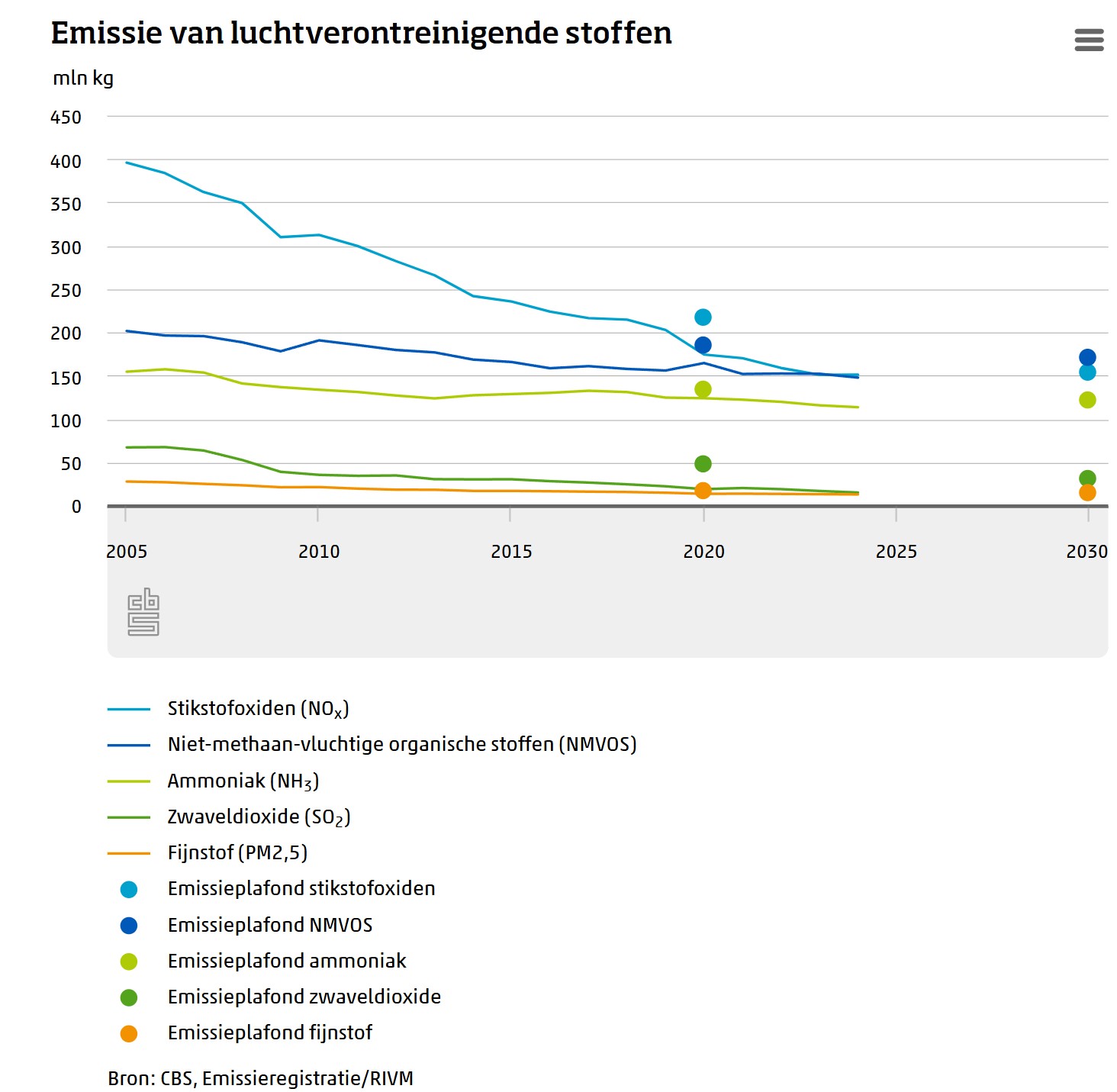 Met Europese wetgeving is voor elke luchtverontreinigende stof een maximale uitstoot vastgelegd ten opzichte van 2005. Er moeten sinds 2020 bijvoorbeeld 45 procent minder stikstofoxiden uitgestoten worden dan in 2005. Vanaf 2030 moet de uitstoot van stifstofoxiden 61 procent lager zijn dan in 2005. Voor alle luchtverontreinigende stoffen was de uitstoot in Nederland sinds 2020 lager dan het emissieplafond dat vanaf toen gold. Ook was de uitstoot van elke stof in 2024 lager dan het plafond dat vanaf 2030 geldt.