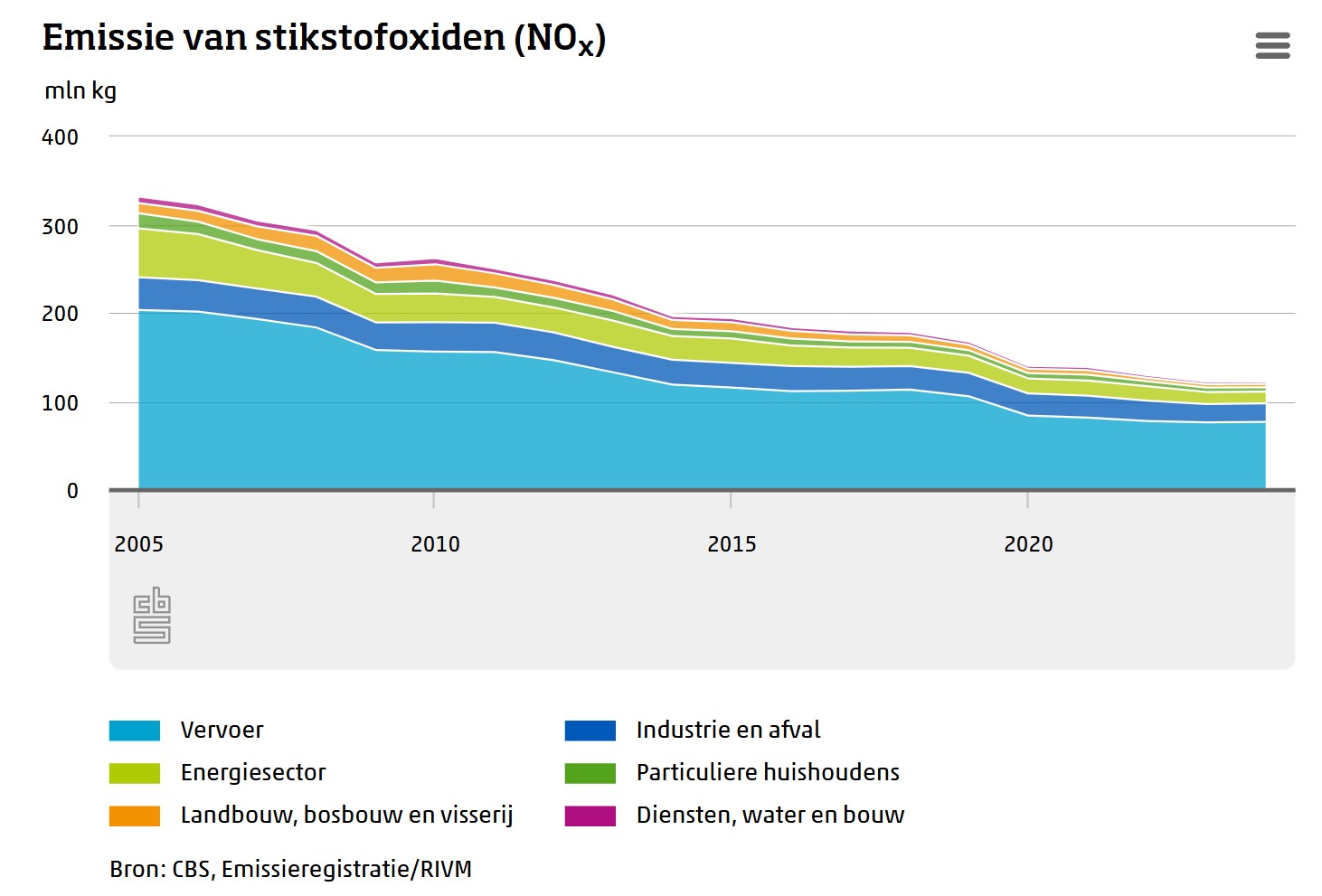 Sinds 2005 worden er bijna ieder jaar minder stikstofoxiden uitgestoten. Stikstofoxiden komen vooral vrij als er fossiele brandstoffen worden gebruikt, en zitten bijvoorbeeld in uitlaatgassen. De meeste uitstoot van stikstofoxiden komt door vervoer. Deze uitstoot is gedaald omdat personenauto’s en vrachtverkeer aan strengere uitstooteisen moeten voldoen. De daling zet waarschijnlijk door, omdat er steeds meer schonere auto’s en vrachtwagens rijden in Nederland. Zo komen er nog steeds meer volledig elektrische auto’s bij, die geen stikstofdioxiden uitstoten.