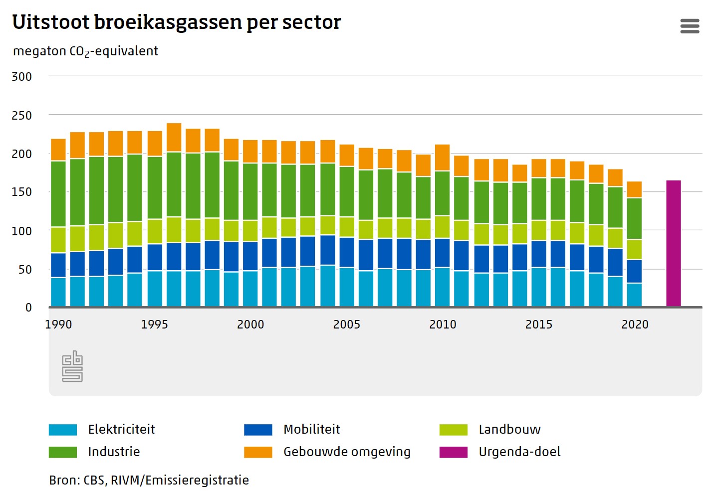 In 2020 was de uitstoot van broeikasgassen in Nederland 25,5 procent lager dan in 1990. De Urgenda-doelstelling (minimaal 25 procent minder uitstoot) is daarmee gehaald. De laatste vijf jaar is de uitstoot door kolencentrales met 80 procent verminderd. In het coronajaar 2020 was de uitstoot door wegverkeer 15 procent lager dan in 2019. Daarnaast was 2020 een relatief warm jaar, waardoor minder aardgas nodig was voor verwarming dan in 2019. Dat meldt het CBS samen met het RIVM op basis van definitieve cijfers uit de emissieregistratie.