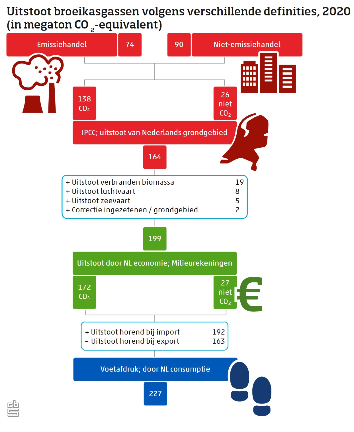 De broeikasgasuitstoot door alle Nederlandse economische activiteiten was in 2020 gelijk aan 199 megaton CO2-equivalent. Dit is 21 procent hoger dan de IPCC-uitstoot (164 megaton). Dit komt onder andere doordat in deze emissieberekening het verbranden van biomassa (19 megaton CO2-equivalent) en de uitstoot door de Nederlandse lucht- en zeevaart (respectievelijk 8 en 5 megaton CO2-equivalent) volledig worden meegeteld, in tegenstelling tot de IPCC-berekening.