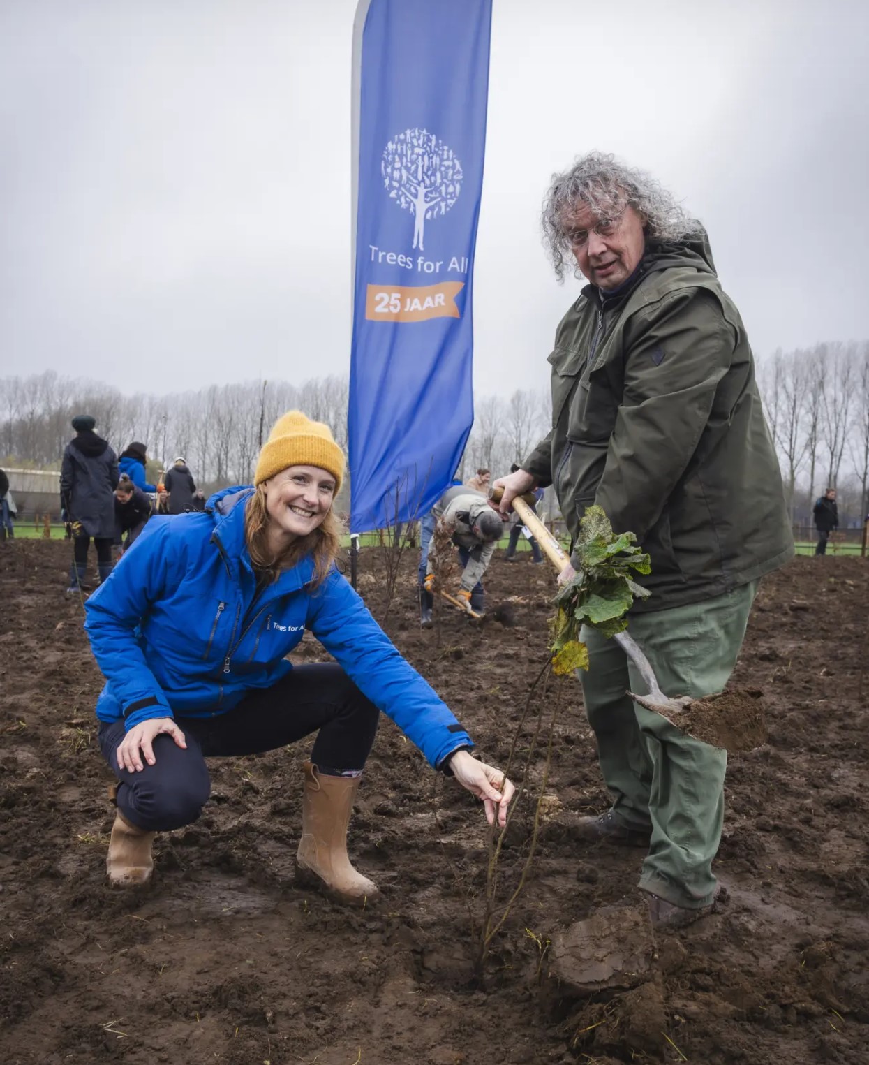 Foto: Marieke Romano (Trees for All) en Ger van den Oetelaar (ARK Rewilding Nederland) planten de 400.000ste boom.