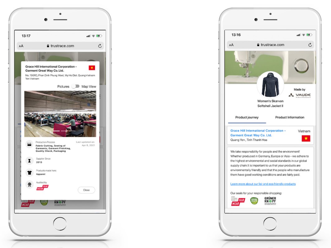 VAUDE maakt de supply chain transparant en laat haar klanten zien waar de producten worden geproduceerd. En zo functioneert het: gewoon in de webshop bij het uitgekozen product op de link “Waar geproduceerd?” klikken en direct ontvang je alle belangrijke informatie over de productiefaciliteit. Foto’s van de gebouwen en van binnen bieden een blik achter de schermen, direct in de productie. Bovendien kun je zien over welke certificaties de betreffende producent beschikt en waar hij zich precies bevindt. Door een klik op het Fair Wear logo kan de gedetailleerde ‘Brand Performance Check’ worden ingezien, volgens welke de producent elk jaar door de Fair Wear wordt beoordeeld.