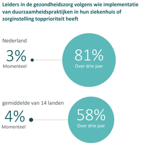 Meer dan 200 partijen hebben de Green Deal Duurzame Zorg ondertekend om de impact van de sector op het milieu te minimaliseren. Vooral vergeleken met leiders in andere onderzochte landen verwachten Nederlandse leiders in de gezondheidszorg dat de implementatie van duurzaamheidspraktijken de komende jaren flink zal stijgen op hun prioriteitenlijst. Uit het Future Health Index 2021-onderzoek valt te concluderen dat Nederlandse leiders in de gezondheidszorg zich inzetten voor minder impact van de sector op het milieu in navolging van de toenemende prioriteit die de overheid toekent aan duurzame gezondheidszorg. Hoewel de implementatie van duurzaamheidspraktijken op dit moment een lage prioriteit heeft, geven leiders in de gezondheidszorg in Nederland blijk van een grote commitment om dit de komende jaren hoger op de agenda te krijgen.