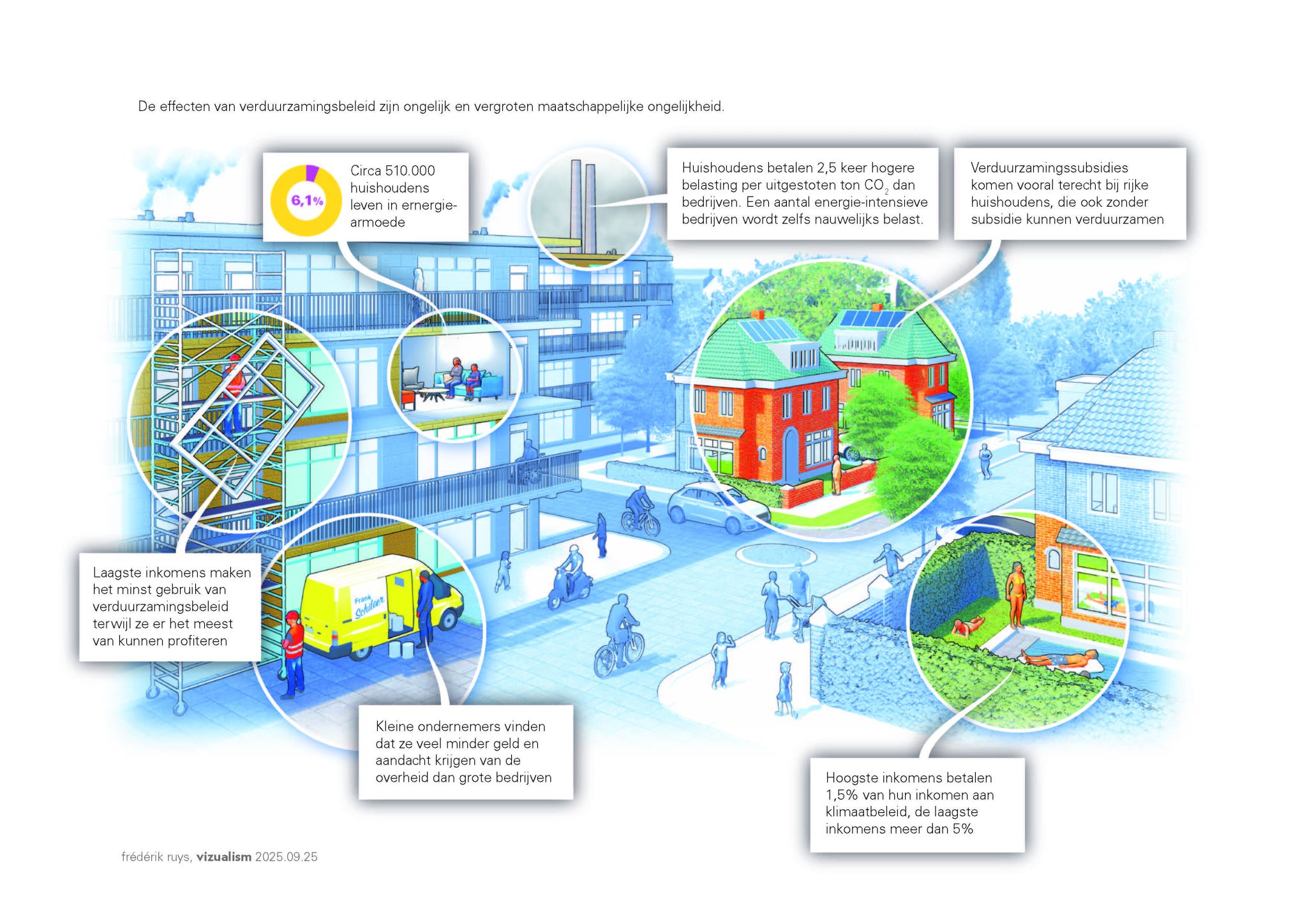 Het is aan de overheid om mensen en bedrijven die dreigen achter te blijven in de verduurzaming, zo veel mogelijk te helpen. Dit vereist dat beleid beter aansluit bij hun leefwereld. Wij zien veel positieve resultaten als gemeenten wijkgericht werken en zij lokale initiatieven – zoals FIXbrigades – ruimte geven, stimuleren en benutten. Daarnaast doen beleidsmakers er goed aan om bij het ontwikkelen van verduurzamingsbeleid meer oog te hebben voor de grote diversiteit in de samenleving. Dit kan bijvoorbeeld door bij beleidsvorming te luisteren naar panels van burgers en kleine ondernemers.