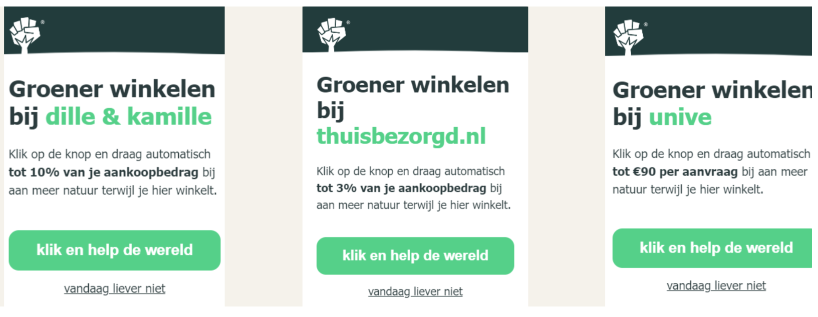 Of het nu gaat om het adopteren van regenwoud, het beschermen van bedreigde diersoorten of het herstellen van gedegradeerd land, met Naturefund ontstaat een beweging om click voor click bij te dragen aan meer biodiversiteit, een beter klimaat en een fijner leven op aarde. Ze beschermen wat er wel is en herstellen wat er niet meer is. Inmiddels zijn 1500 winkels aangesloten en willen ze dit aantal verdubbelen voor eind 2024. Onder de aangesloten sites bevinden zich bedrijven als HEMA, Bever, Dille & Kamille, Thuisbezorgd.nl, Univé, O’Neill en Europarcs.