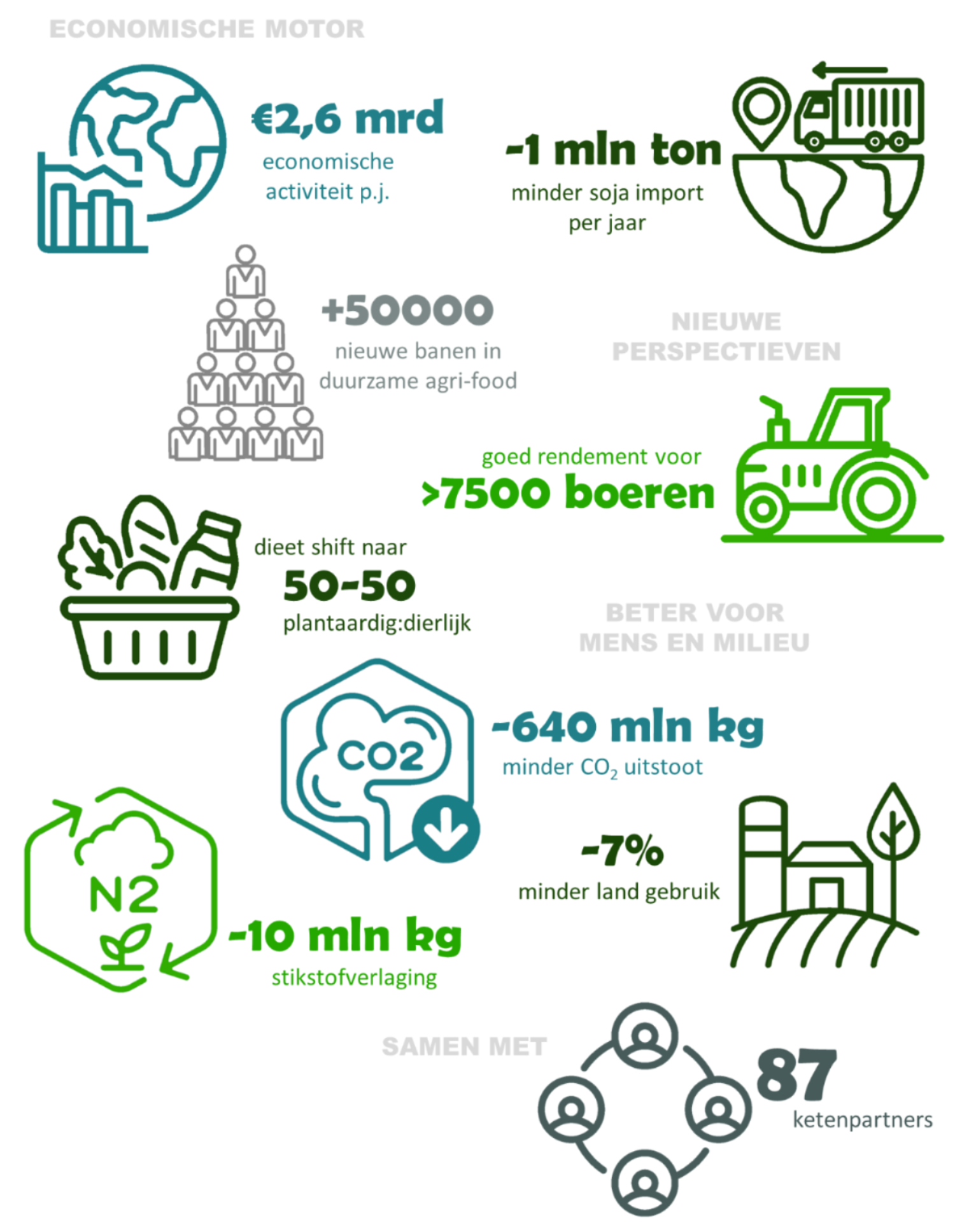 De ambitie van de 87 betrokken partijen is om de inname van peulvruchten in Nederland te verdubbelen vóór 2030. Om dat doel te halen, zetten zij in het masterplan in op de landbouw, de voedingsindustrie en de consument. Voor boeren is het plan gericht op economische haalbaarheid bij het telen van gewassen met veel plantaardige eiwitten, zoals sojabonen, erwten, veldbonen en lupine. Daarvoor moet de opbrengst per hectare omhoog en de bestrijding van plant en teelt-ziektes verbeteren. De voedingsindustrie heeft behoefte aan kennis om hun productieprocessen om te schakelen van geïmporteerde sojaboon naar Nederlandse peulvruchten.