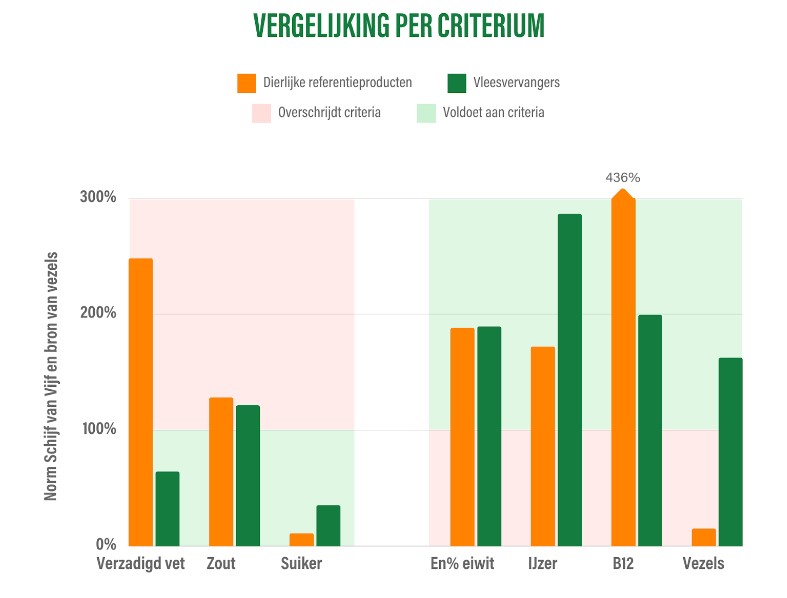- Plantaardige burgers, gehakt, gehaktballetjes, (rook)worst, en spek scoren gemiddeld beter op de criteria van het Voedingscentrum voor vleesvervangers dan vergelijkbare dierlijke vleesproducten. Bij shoarma en nuggets hebben de plantaardige producten een vergelijkbare score als de dierlijke. Alleen bij de kipstukjes, kipfilet en schnitzel scoren de dierlijke vleesproducten gemiddeld beter. In deze categorieën zijn echter ook veel vleesvervangers die aan alle criteria van de Schijf van Vijf voldoen.