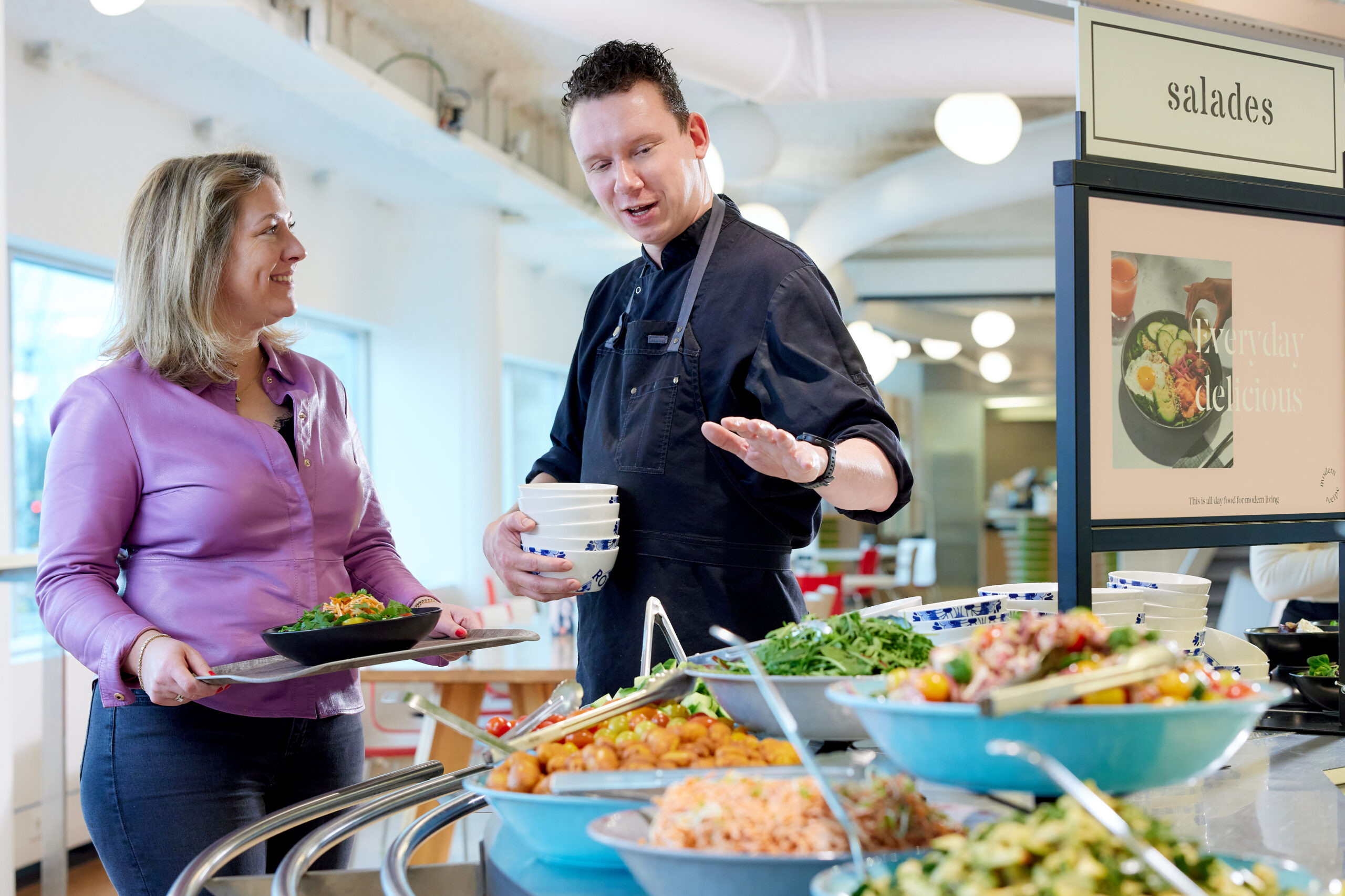 Fay Dalmeijer: “We waren op zoek naar een manier om onze medewerkers meer met elkaar te verbinden en ze vaker naar kantoor te laten komen. Modern Recipe biedt gevarieerd, kwalitatief hoogwaardig en verrassend eten, op elk moment van de dag. In ons nieuwe restaurant geniet je nu samen van gerechten uit het seizoen met ingrediënten die lokaal worden ingekocht. Er zijn veel plantaardige opties en de versbeleving is fantastisch.”