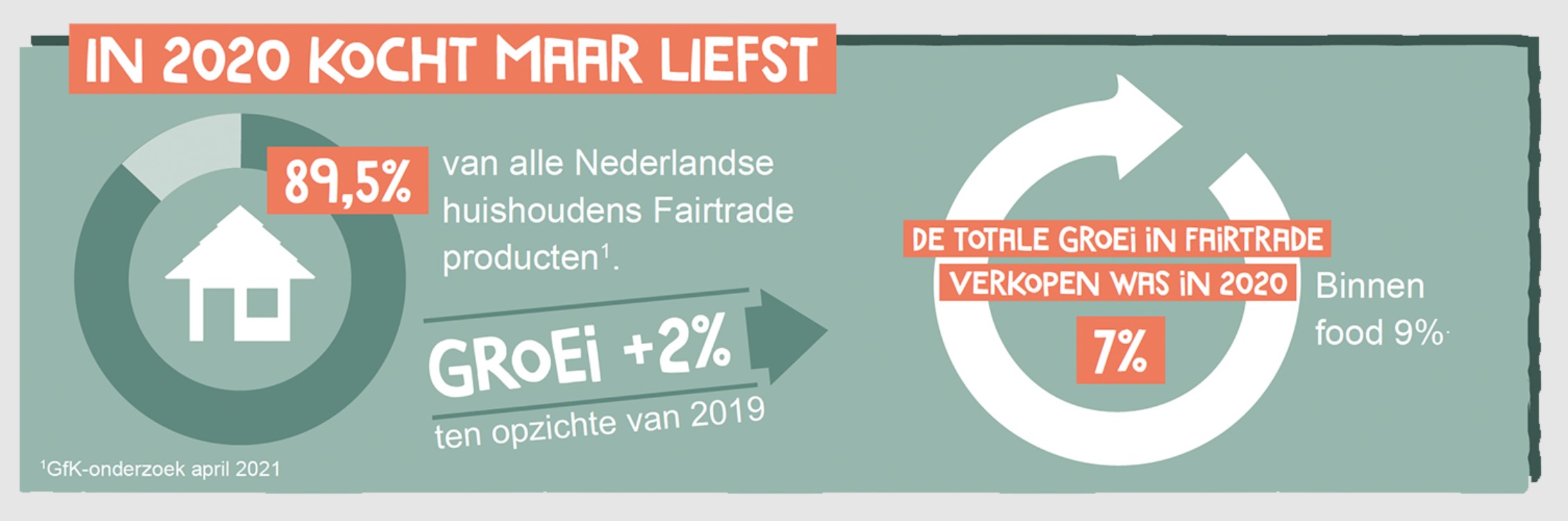Fairtrade heeft ondanks de lockdown in 2020 ten opzichte van 2019 een positieve ontwikkeling doorgemaakt. De nationale maatregelen als gevolg van de COVID-19-pandemie hebben geresulteerd in een verschuiving van volumes van de buitenshuismarkt naar supermarkten. Het thuiswerken en de sluiting van de horeca hebben geleid tot lagere verkopen van Fairtrade koffie (-19%) en thee (-1%). Daarentegen zijn de verkopen van categorieën als cacao, desserts en kookproducten fors gestegen.