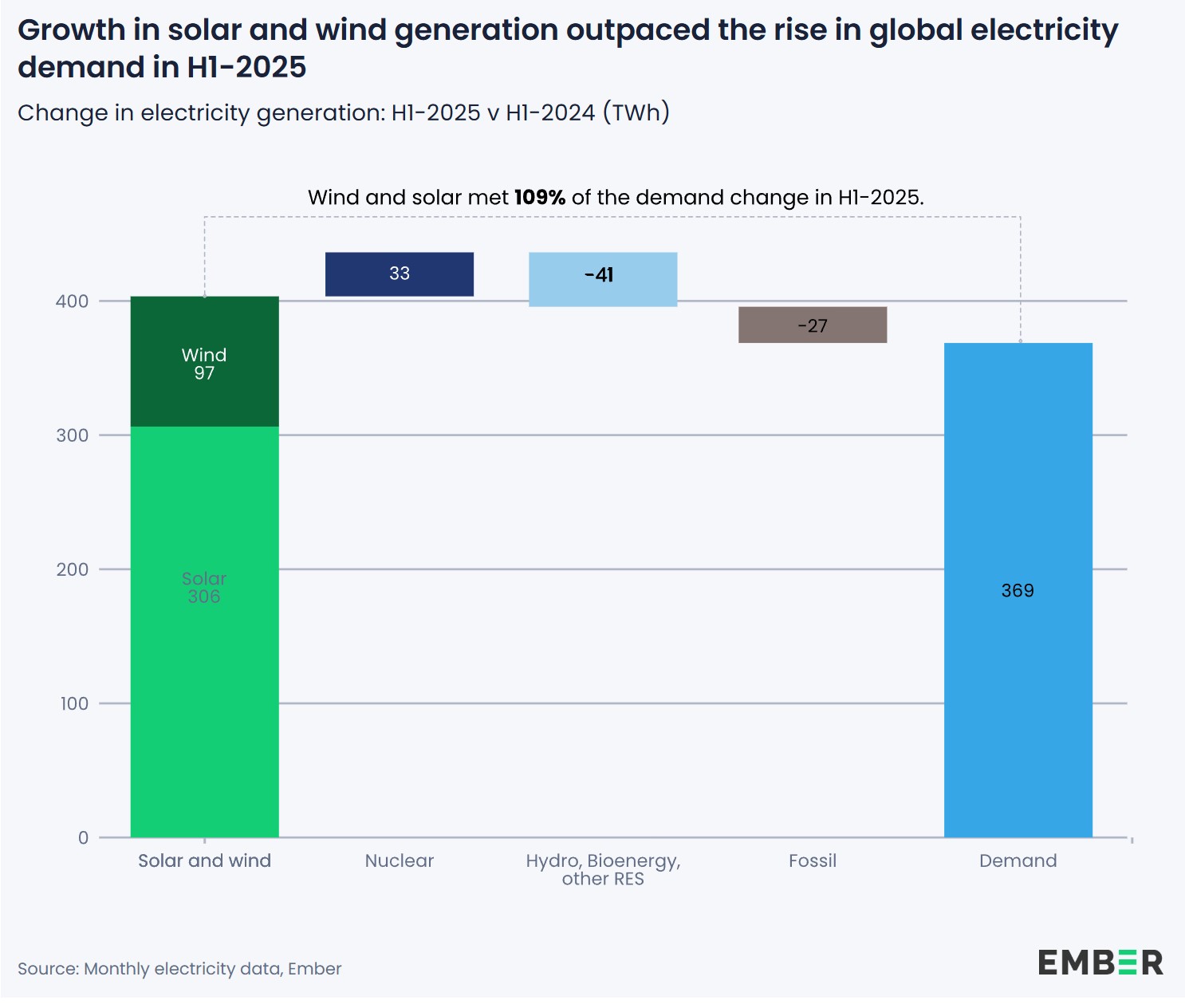 De wereldwijde vraag naar elektriciteit steeg in de eerste helft van 2025 met 2,6%, een toename van 369 TWh ten opzichte van dezelfde periode vorig jaar. Zonne-energie alleen al nam 83% van de stijging voor zijn rekening, dankzij een recordgroei in absolute termen (306 TWh, +31% op jaarbasis).