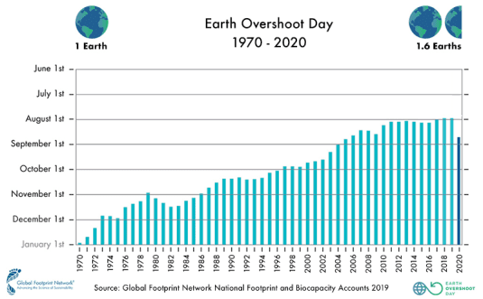 Op Earth Overshoot Day heeft de mensheid alle natuurlijke hulpbronnen gebruikt die de aarde het hele jaar door kan aanvullen – inclusief het vermogen van natuurlijke ecosystemen om koolstofemissies van het verbranden van fossiele brandstoffen te absorberen. Deze aanzienlijk latere datum, vergeleken met vorig jaar, weerspiegelt een vermindering van de wereldwijde ecologische voetafdruk met bijna tien procent tussen 1 januari en Earth Overshoot Day. Volgens onderzoek van Global Footprint Network werd dit grotendeels veroorzaakt doordat we minder zijn gaan reizen en bouwen als gevolg van door COVID-19 veroorzaakte lockdowns over de hele wereld. De CO2-uitstoot daalde met 14,5 procent en het kappen van hout en andere bosproducten daalde met 8 procent.