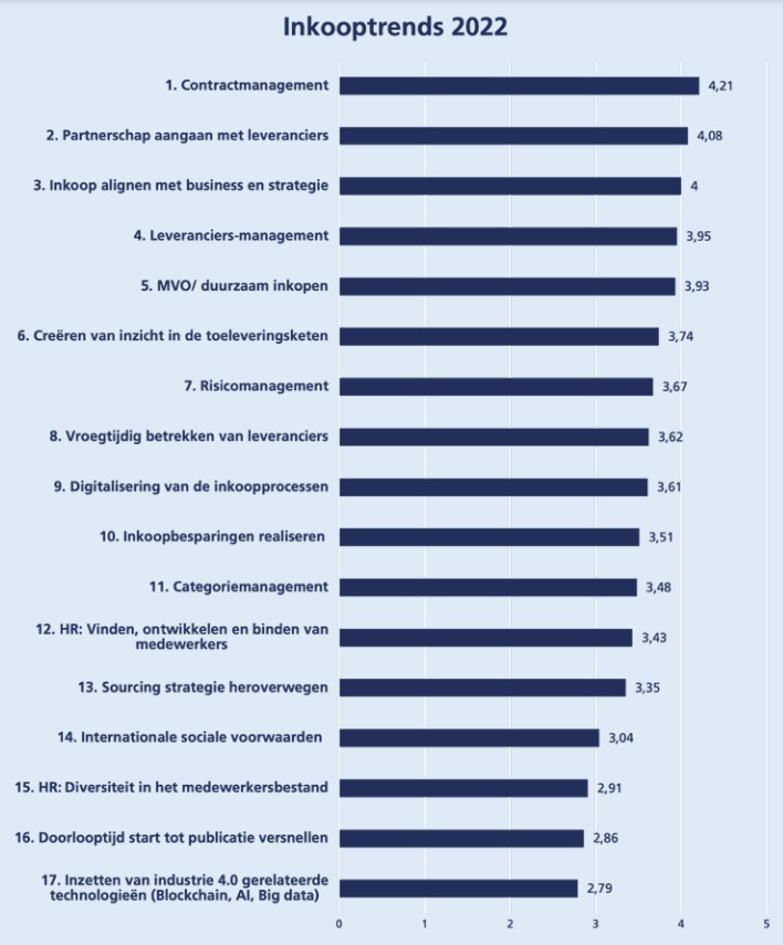 Aan respondenten is de volgende vraag gesteld: Geef voor elk van de 17 thema’s aan hoeveel prioriteit u het thema in 2022 van plan bent te geven. Hierbij is een vijfpuntschaal gebruikt, oplopend van (1) heel weinig prioriteit tot (5) heel veel prioriteit. De top 3 inkooptrends voor 2022 zijn als volgt:
