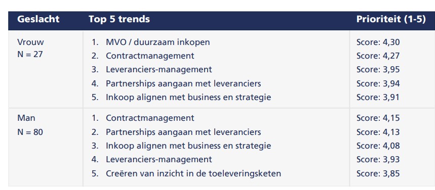 Ook als we kijken naar het verschil tussen mannelijke en vrouwelijke respondenten, zien we vier dezelfde onderwerpen terugkomen in de top 5. Het meest opvallende is toch wel dat vrouwelijke inkoopprofessionals de meeste prioriteit geven aan duurzaam inkopen, terwijl dit onderwerp bij de mannelijke inkopers met een score van 3,8 de top 5 niet heeft gehaald.