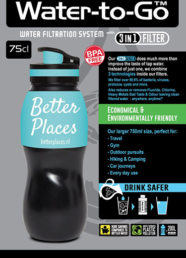 De Britse filterflessenproducent Water-to-Go maakt herbruikbare, hervulbare en recyclebare waterflessen die ziekteverwekkers uit het kraanwater filteren. Zo wordt elke niet-zout waterbron, overal ter wereld veilig drinkbaar. De fles kun je eindeloos blijven gebruiken. Het enige onderdeel dat je af en toe moet vervangen is het filter. Ook die is 100% recyclebaar. Met de Water-to-Go in je koffer of backpack heb je nooit meer een reden om plastic flesjes te kopen.