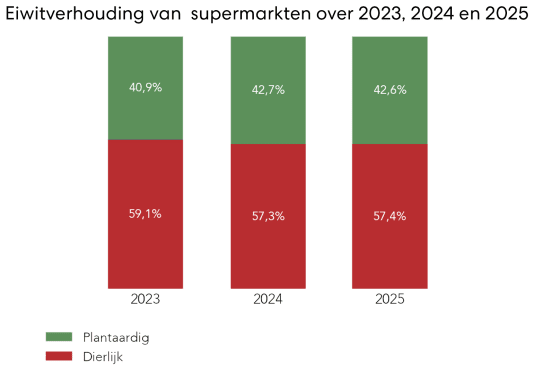 Uit de eiwitverkoopcijfers 2025 blijkt dat het aandeel plantaardige eiwitten met 42,6% licht gedaald is in vergelijking met 2024. Het aandeel verkochte dierlijke eiwitten is 57,4%. Met dertien deelnemende ketens, variërend van marktleiders als Albert Heijn en Jumbo tot digitale spelers als Picnic en Crisp, en biologische formules als Ekoplaza en Odin, is meer dan 95% van de Nederlandse markt vertegenwoordigd in de meting. Hoewel deze rapportage de internationale koplopersrol van Nederland op het gebied van doelstellingen en transparantie bevestigt, laten de cijfers zien dat het huidige tempo onvoldoende is om het doel van 60% plantaardig eiwit voor 2030 te halen. Uitzonderingen zijn Ekoplaza en Odin, zij verkochten in 2024 al meer dan 60% plantaardige eiwitten.