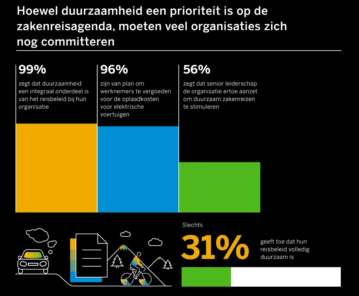 Amper 28% van organisaties in de Benelux heeft een duurzaamheidsmanager aangesteld, laat staan een heel team (slechts 8%) dat zich specifiek bezighoudt met het intern verbeteren van duurzaamheid – waaronder zakenreizen. Toch wordt duurzaamheid voor almaar meer beslissingsnemers een topprioriteit, zeker in het licht van de VN-klimaatdoelstellingen.