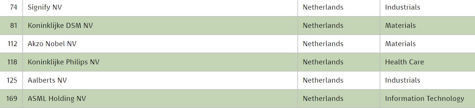 As You Sow en Corporate Knights hebben hun zevende update van de Carbon Clean 200 gepubliceerd. De Clean200 zijn de 200 grootste beursgenoteerde ondernemingen die voorop lopen met oplossingen voor de transitie naar een schone energietoekomst en zijn gerangschikt op basis van de inkomsten met thema’s als schone economie, waaronder energie-efficiëntie; groene energie; elektrische voertuigen en de financiering van koolstofarme oplossingen. De nieuw gepubliceerde lijst is bijgewerkt met gegevens tot en met eind 2020 (31 december 2020). Er staan 6 Nederlandse ondernemingen in de lijst: Signify, DSM, AkzoNobel. Philips, Aalberts en ASML.
