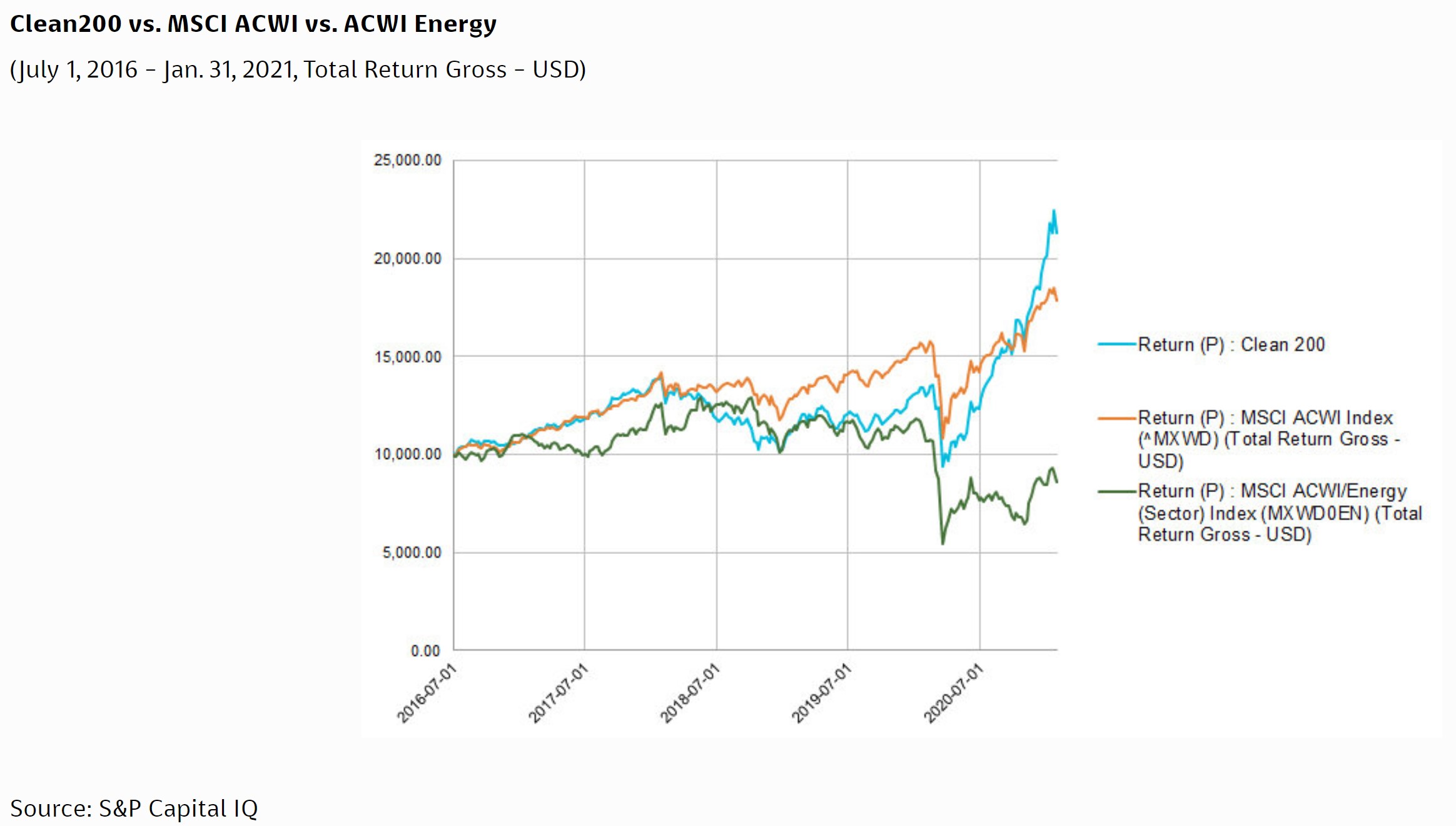 - Clean200-bedrijven genereerden een totaal rendement van 113,41% door de MSCI ACWI brede marktindex (78,67%) en MSCI ACWI / Energy Index van fossiele brandstofbedrijven (-13,83%) te verslaan op basis van Total Return Gross – USD Basis vanaf de Clean200-start van juli 1, 2016 tot 31 januari 2021.