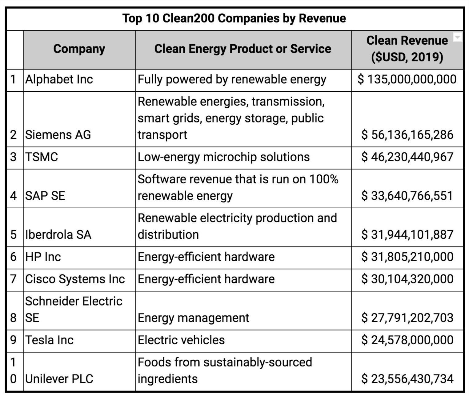 De Clean200-bedrijven worden weergegeven op basis van hun geschatte groene inkomsten in USD. De dataset is ontwikkeld door de meest recente jaarinkomsten van een bedrijf te vermenigvuldigen met zijn zuivere inkomstenraming, voornamelijk afkomstig van Corporate Knights Research. Om in aanmerking te komen, moet een bedrijf een USD-omzet hebben van ten minste $ 1 miljard (meest recente beschikbare gegevens aan het einde van het fiscale jaar) en meer dan 10% van de totale inkomsten uit schone bronnen halen.